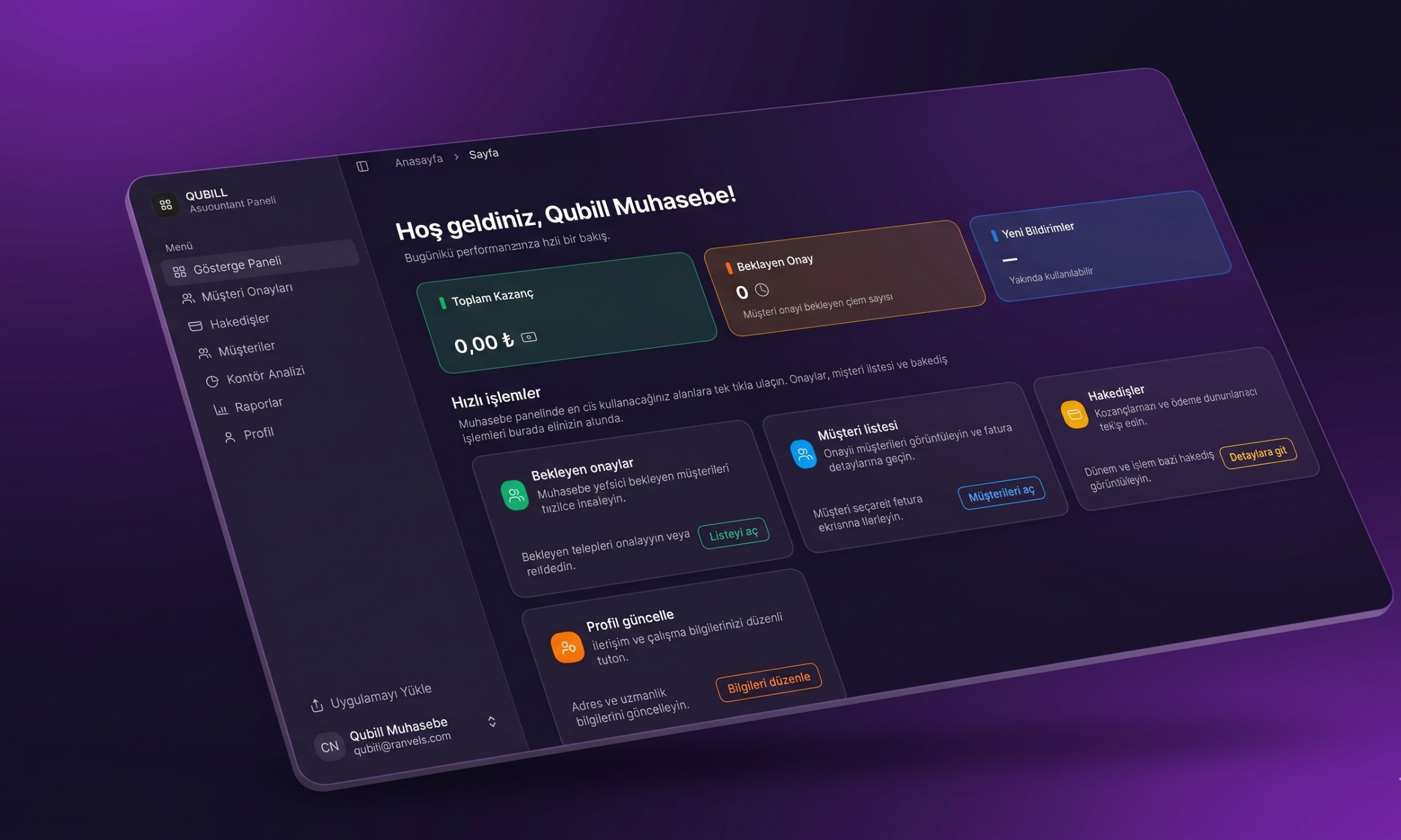 Kullanıcı kaydınızı oluşturduktan sonra sisteme kayıtlı e-posta adresiniz ve şifrenizle giriş yapın. Başarılı giriş sonrasında Qubill kullanıcı paneli sizi karşılayacaktır.